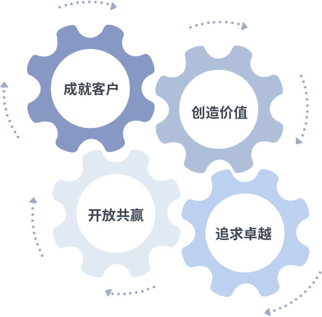 成就客户是一切决策的出发点,,,创造价值是衡量所有工作的标准,,,追求卓越是我们做事做人的态度,,,,开放共赢是我们的格局也是最终的结果。。价值观的齿轮环环相扣,,推动着组织里的每个人不断向前。。。