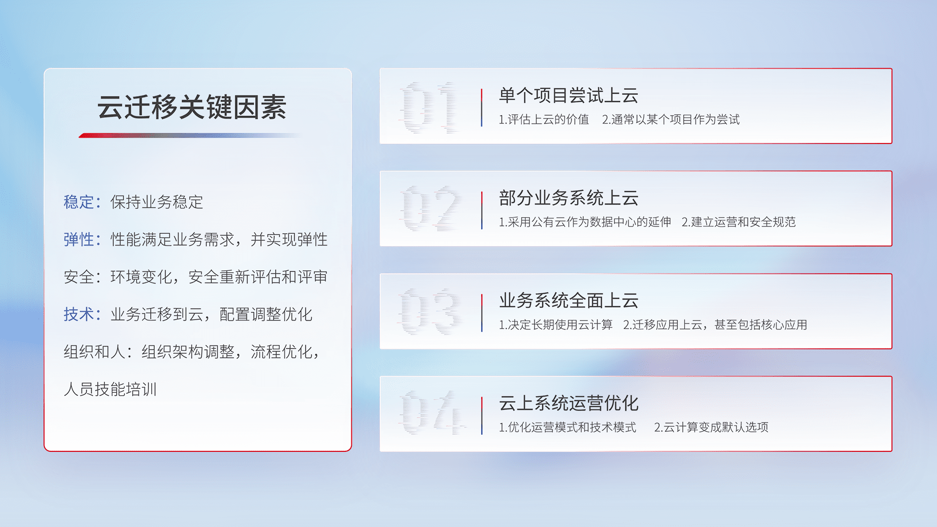 结合实际业务,,从规划设计、、、、云平台选型、、、云原生改造、、数据迁移、、、集成交付,,,,迁移全过程为客户识别最佳上云路径,,,,做好风险识别管理,,,设计网络架构、、、、身份权限、、安全审计合规、、、、操作审计、、、日志审计、、、、监控告警策略、、、、多站点容灾设计等,,对云上基础设施进行整体规划,,,,提升IT治理水平,,,,以满足弹性、、、高可用、、、高性能的需求。。。。