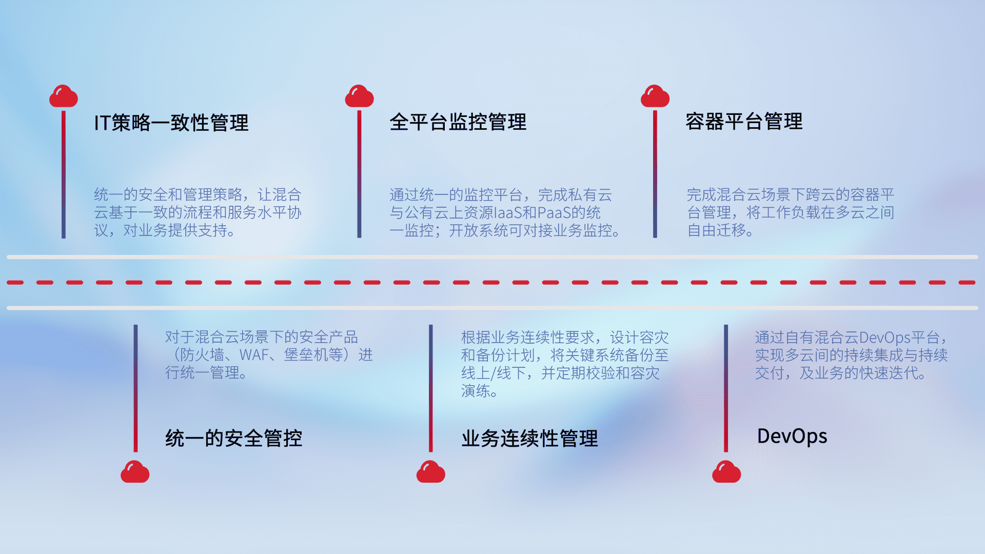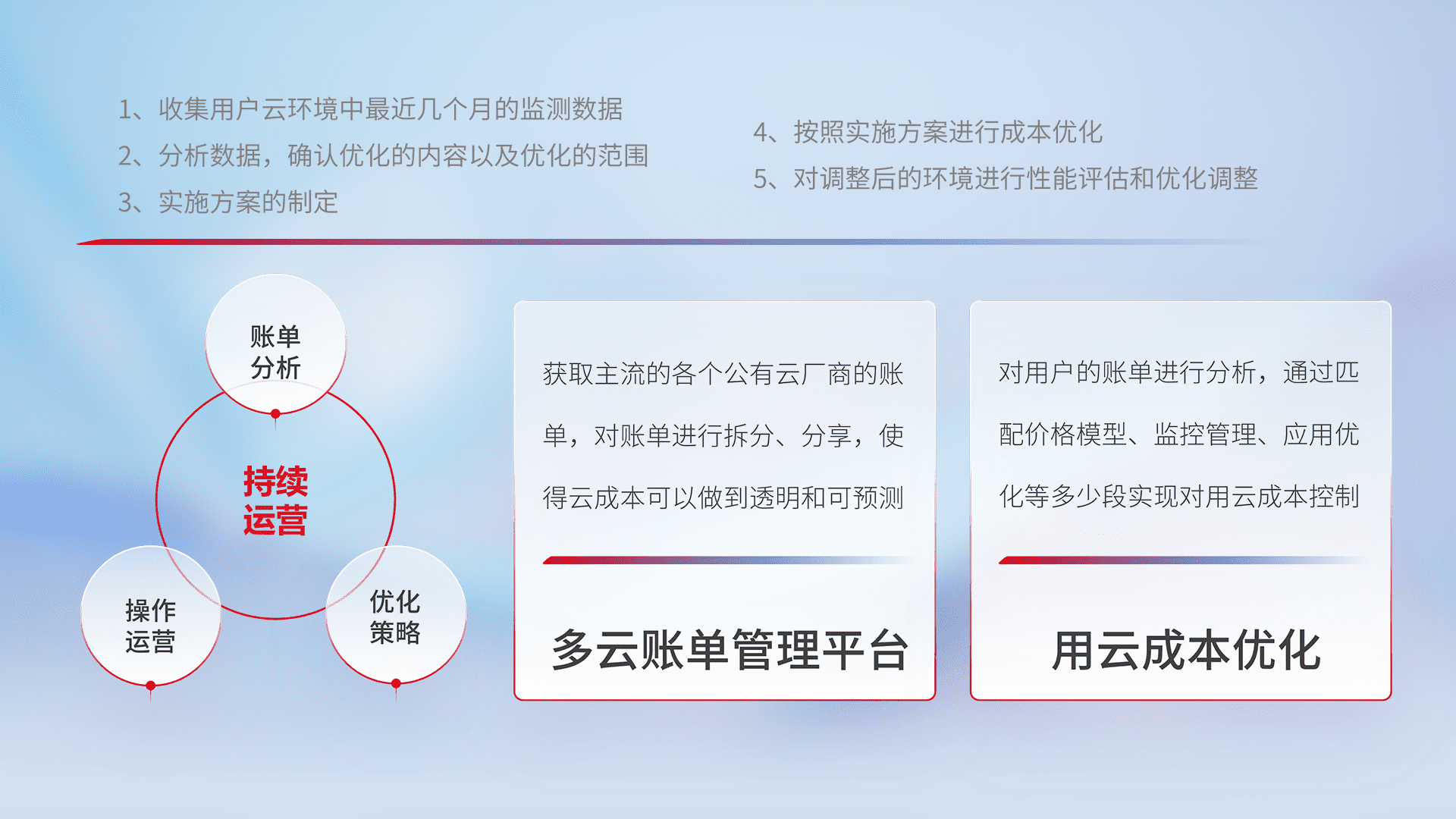 通过多云纳管,,以统一的资源数据模型把客户的云资源进行抽象和封装,,,,进而实现对多云资源的统一操作,,,保障云资源管理的可靠性、、、稳定性与可用性。。。量身定制化运维内容,,配置、、、开发运维、、补丁管理、、备份、、监控、、认证和访问管理、、审计和日常巡检等,,,,保障在用云过程中的可靠度,,稳定度以及高可用率。。。。