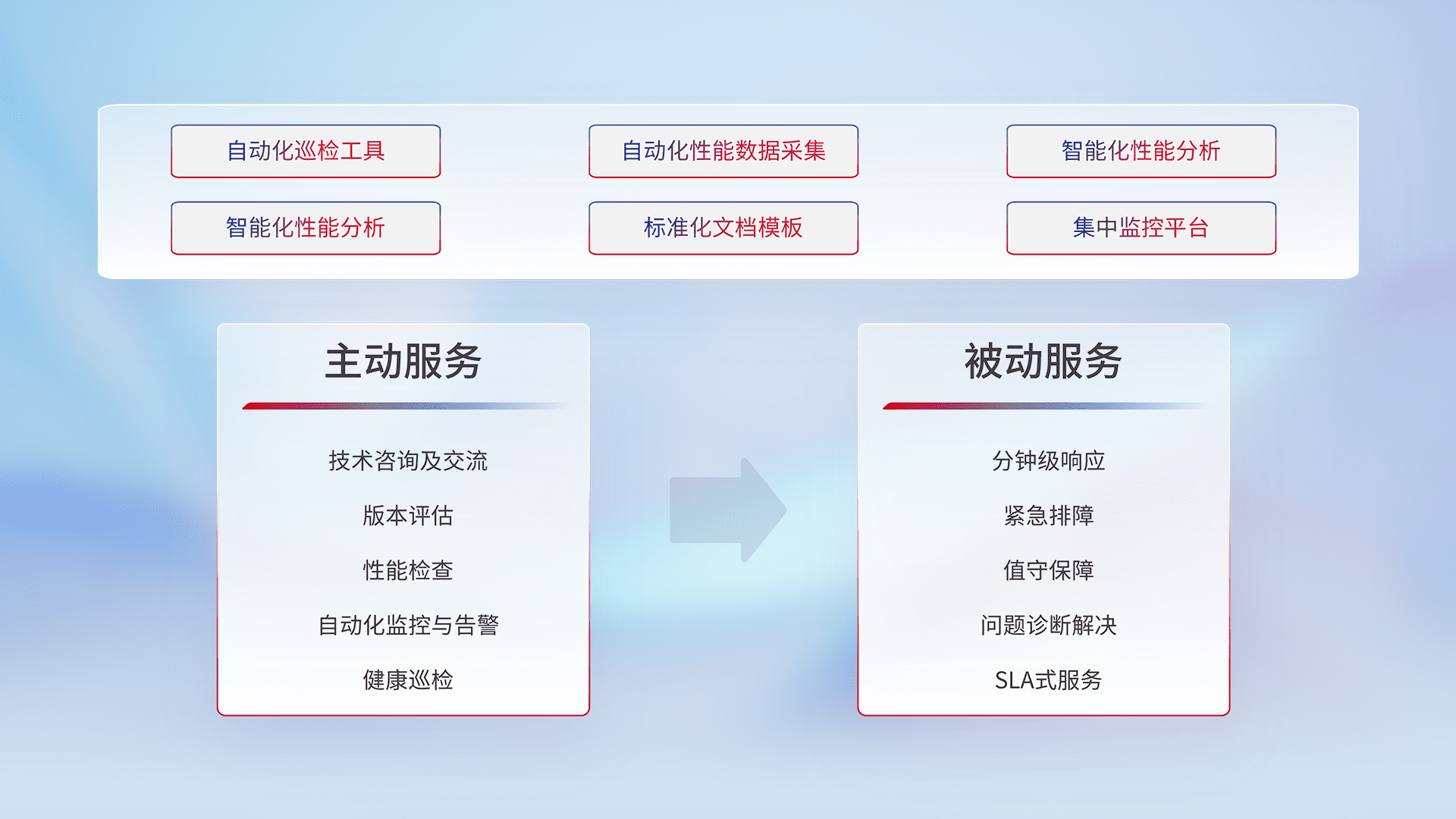 智能化工具和标准化文档,,,,保障服务质量,,,,提供主动服务(包含技术咨询、、版本评估、、、性能检查、、、、自动化监控与告警、、、健康巡检)和被动服务包含(分钟级响应、、、、紧急排障、、值守保障、、问题诊断解决、、、SLA服务)。。。