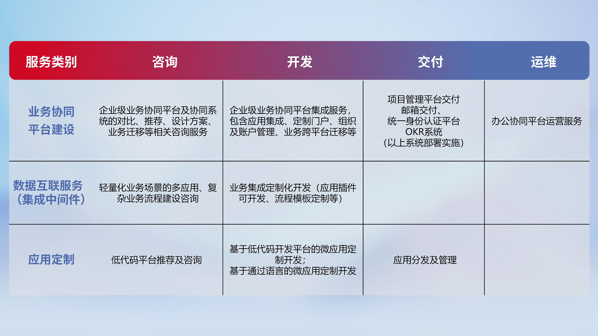 针对钉钉、、、企微、、、IDaas等平台级产品提供产品的规划、、方案、、、、交付、、、、定制化开发等服务,,,实现如统一协同办公、、、智能客户服务、、、混合会议管理、、智能数据查询、、、等业务场景,,,实现数字化转型。。